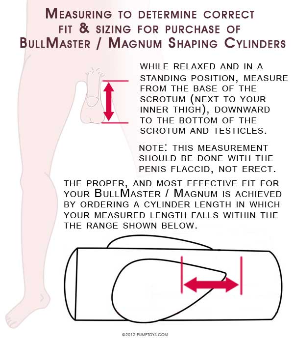 The BMC Cylinder size you order should be based on TWO primary dimensions and your personal preferences. These dimensions are the way the length of the penis pocket, and the length to the center of the testicle or ball pocket contours. The objects are to keep the penis contour equal to your length or longer, while getting the cylinder short enough that your testicles center in the ball contour pockets.
