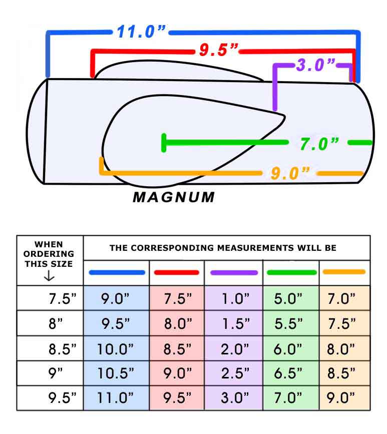 Below you will find two new color-coded dimension referencing charts, one for the BullMaster, one for the Magnum. These charts will help you to order the length of cylinder that will suit you best. Each principal dimension point is measured by it's relation to the entry of the cylinder, and each of these will change according to the length you order. Select a length from the left side of the chart, and the corresponding dimensions for each color-coded reference point is shown on that row as the columns intersect